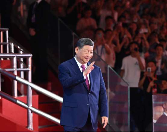 11月9日晚,中共中央总书记、国家主席、中央军委主席习近平在广东省广州市出席中华人民共和国第十五届运动会开幕式并宣布运动会开幕。这是习近平在主席台上向大家挥手致意。新华社记者 谢环驰 摄