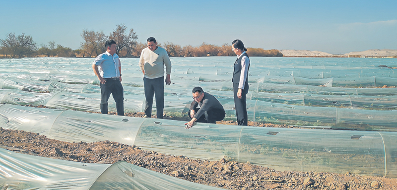 中行吐鲁番市分行工作人员仔细查看瓜苗出苗情况及幼苗长势(4月8日摄)。梁磊 摄