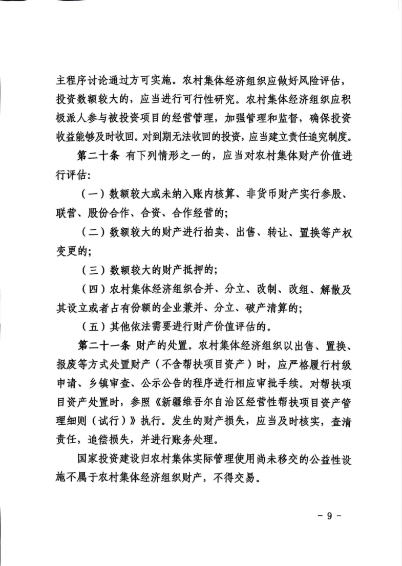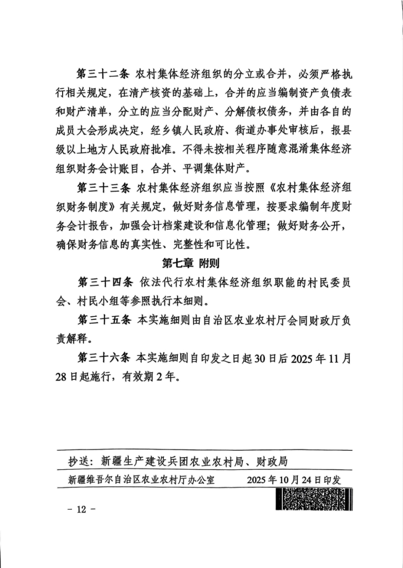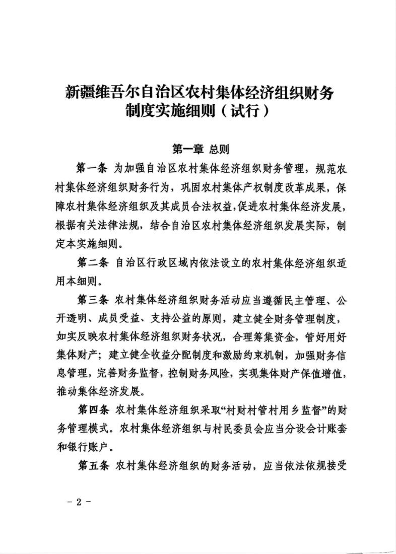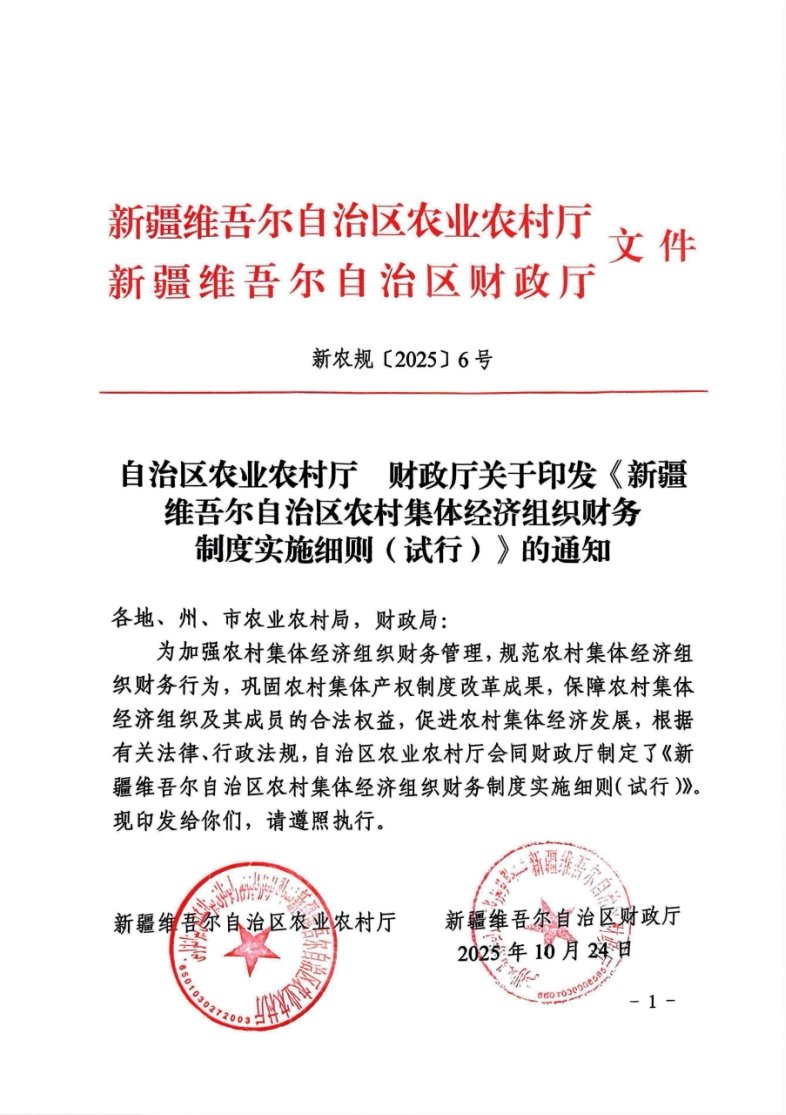 【本部门规范性文件】自治区农业农村厅 自治区财政厅关于印发《新疆维吾尔自治区农村集体经济组织财务制度实施细则(试行)》的通知