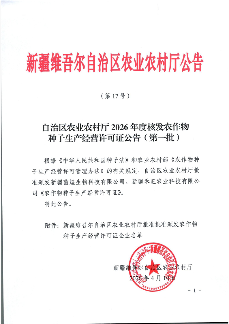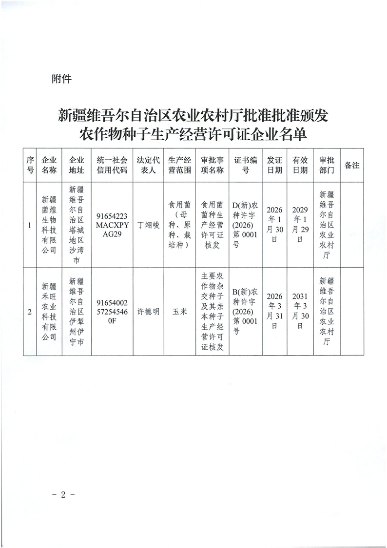 自治区农业农村厅2026年度核发农作物种子生产经营许可证公告(第一批)