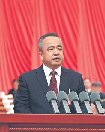 1月27日,艾尔肯·吐尼亚孜代表自治区人民政府,向大会作政府工作报告。石榴云/新疆日报记者 谢龙 摄
