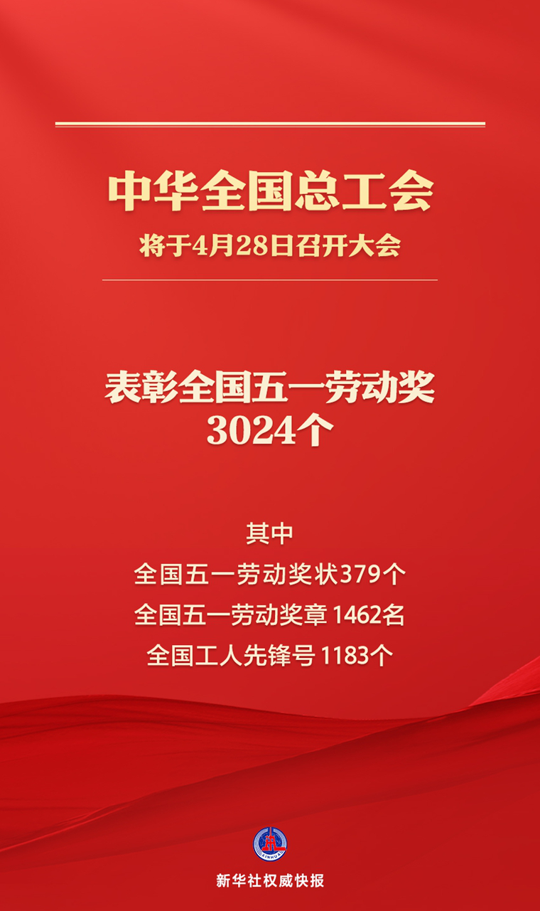 新华社北京4月27日电(记者樊曦)“五一”国际劳动节即将到来。记者27日从中华全国总工会获悉,全国总工会将于4月28日召开庆祝“五一”国际劳动节暨全国五一劳动奖表彰大会,届时将表彰全国五一劳动奖3024个,其中全国五一劳动奖状379个、全国五一劳动奖章1462名、全国工人先锋号1183个。