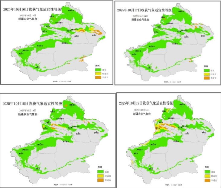 10月16—19日收获气象适宜性等级预报。新疆农业气象台供图