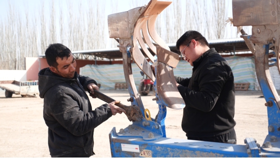 2月24日,沙雅县大欣农机专业合作社,农机技术人员和村民正在为农机具进行“体检”。王水江 摄
