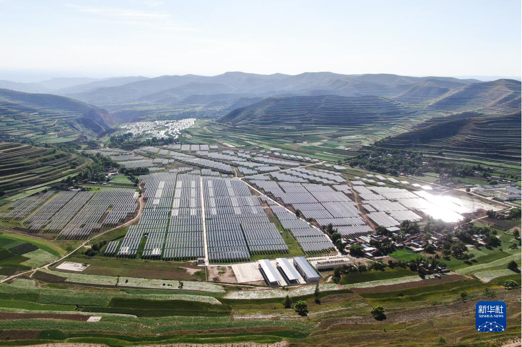这是2022年6月15日在甘肃省定西市通渭县榜罗镇四新村拍摄的集中式光伏电站(无人机照片)。新华社记者马希平摄