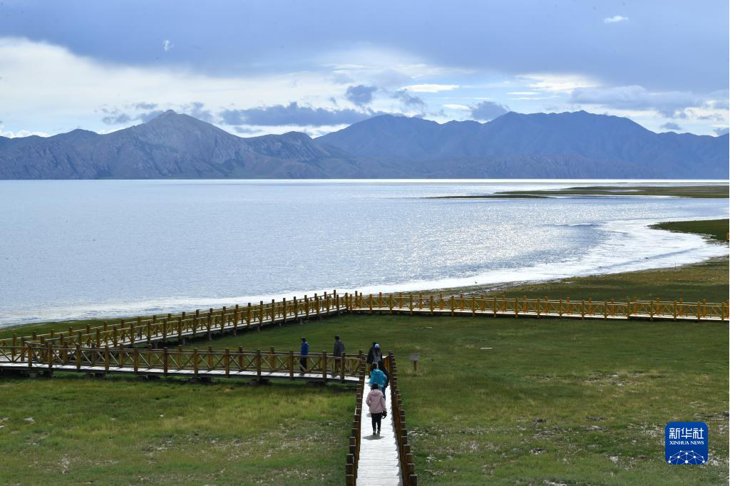 游客行走在青海省果洛藏族自治州玛多县冬格措纳湖岸畔的木栈道上(2022年8月14日)。新华社发(卡娅梅朵摄)