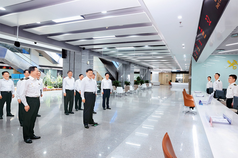 2024年10月15日至16日,中共中央总书记、国家主席、中央军委主席习近平在福建考察。这是16日上午,习近平在中国(福建)自由贸易试验区厦门片区考察时,同综合服务大厅窗口工作人员亲切交流。新华社记者鞠鹏/摄