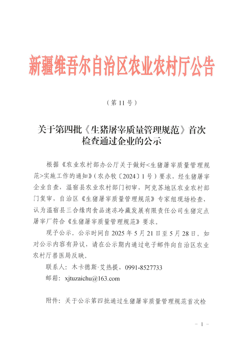 关于第四批《生猪屠宰质量管理规范》首次检查通过企业的公示