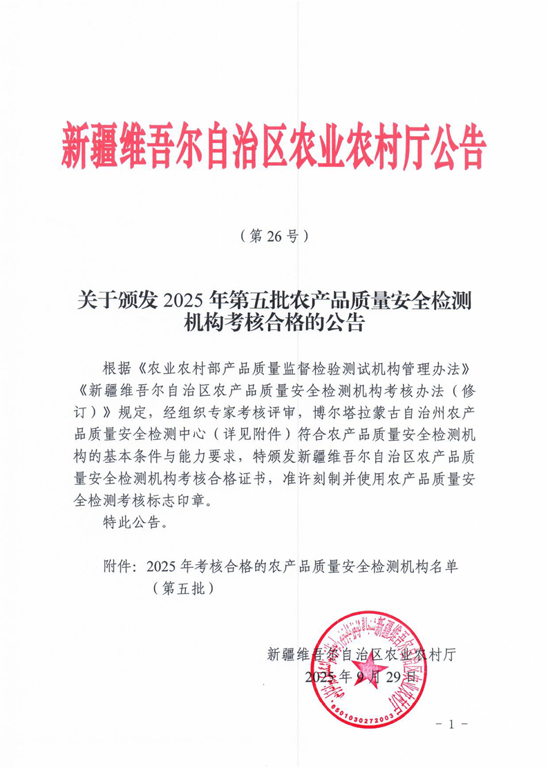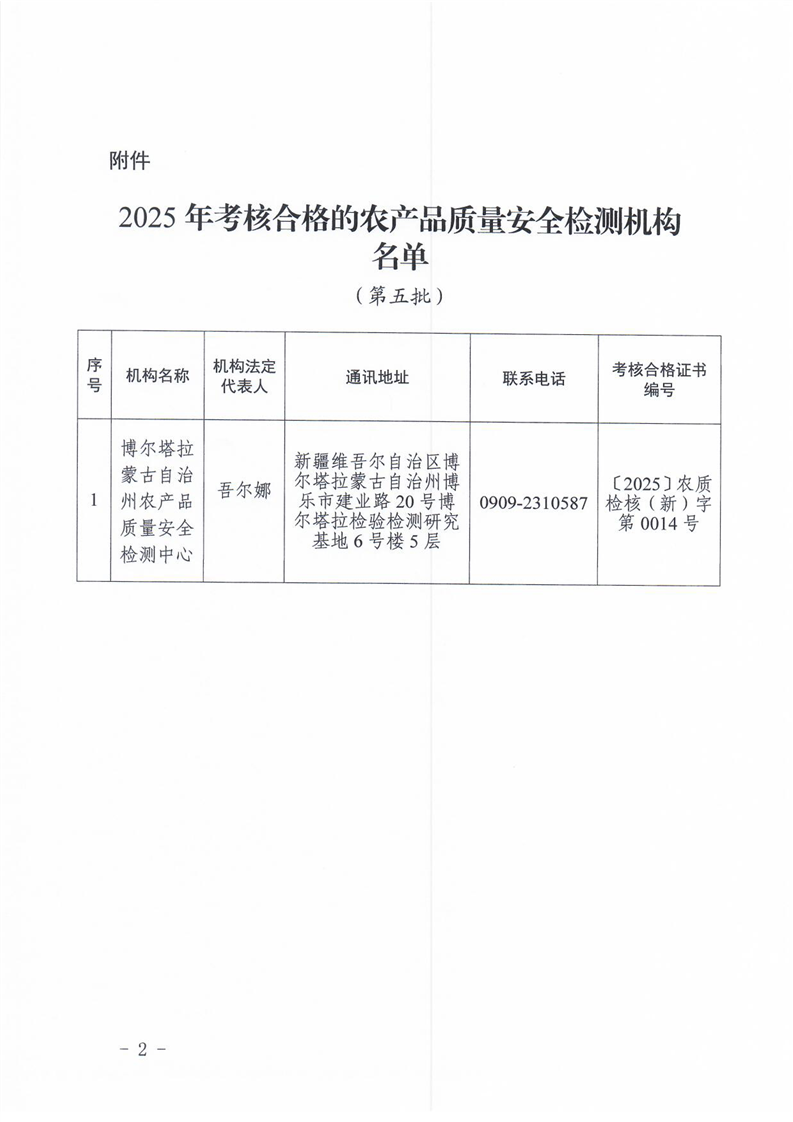 关于颁发2025年第五批农产品质量安全检测机构考核合格的公告