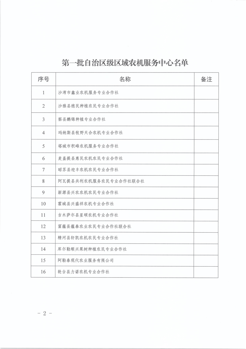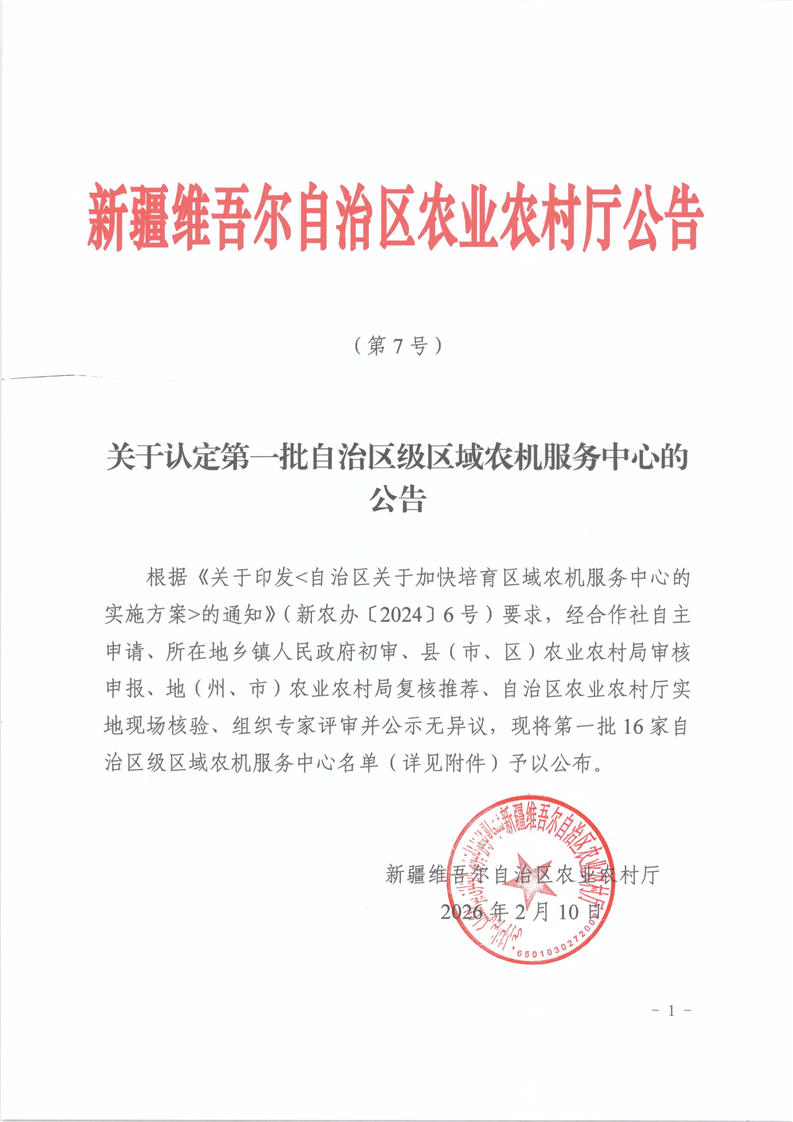 关于认定第一批自治区级区域农机服务中心的公告