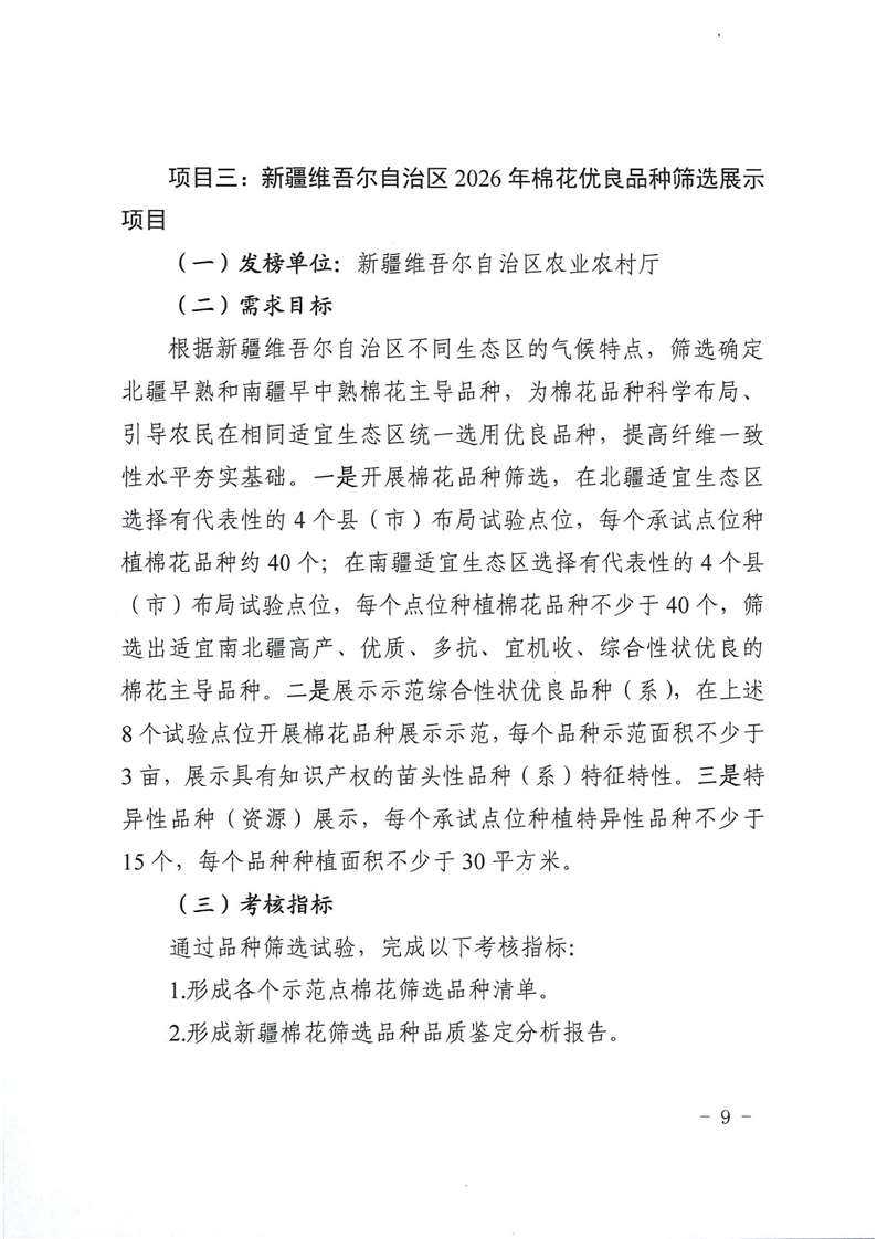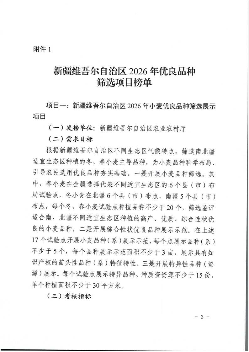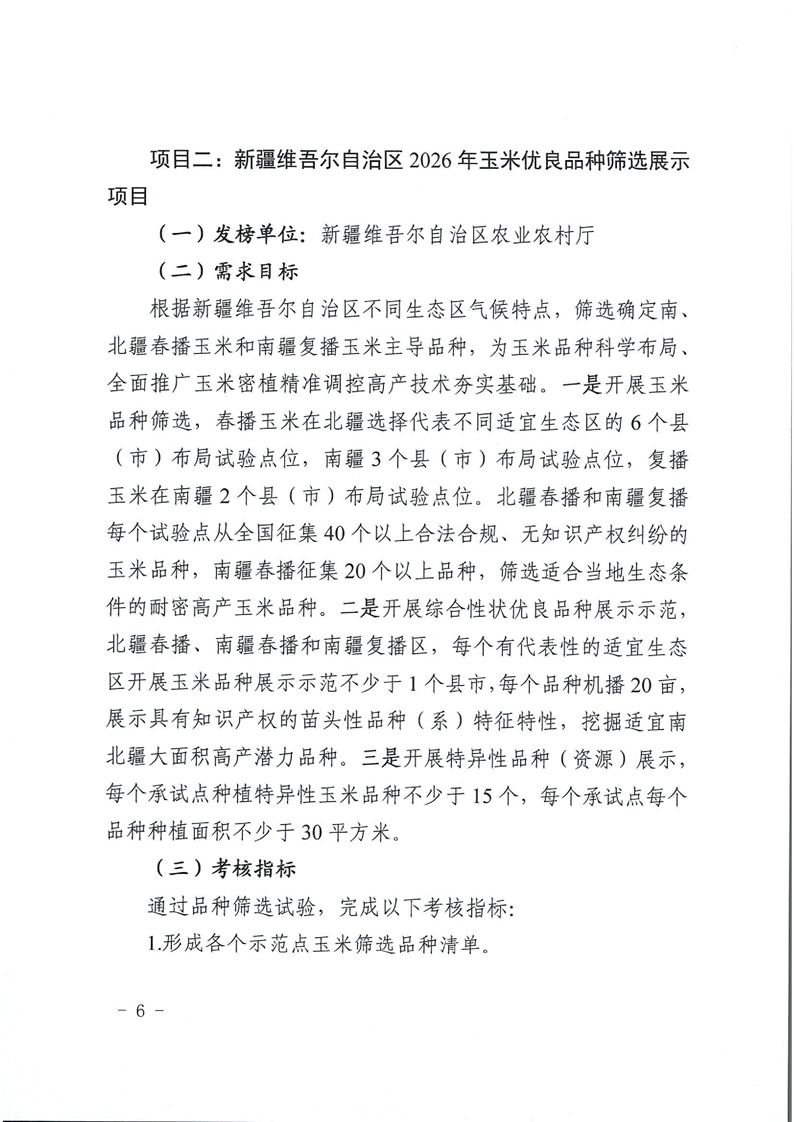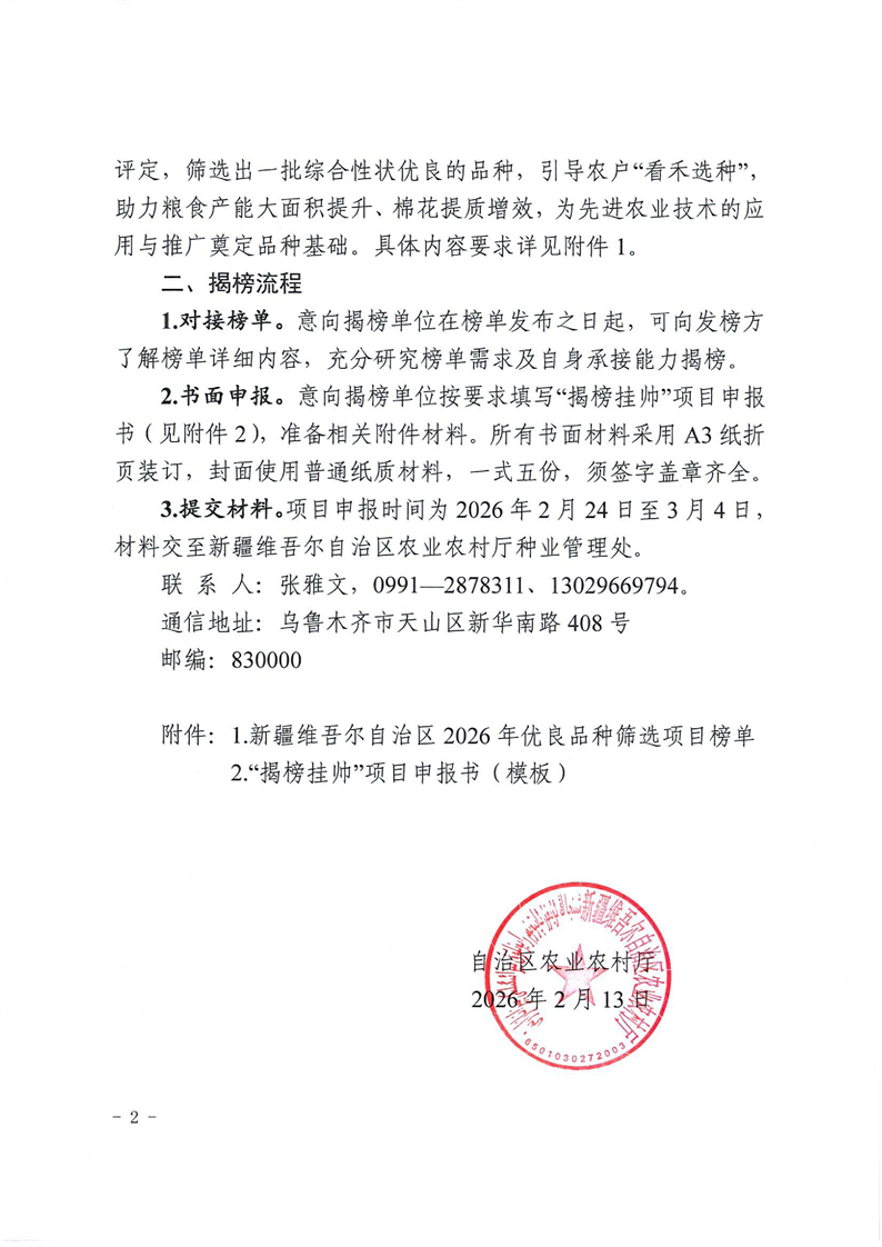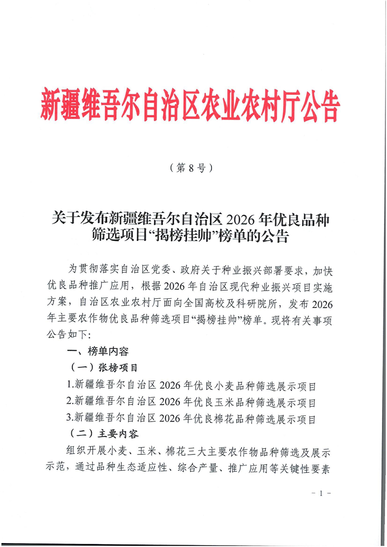 关于发布新疆维吾尔自治区2026年优良品种筛选项目“揭榜挂帅”榜单的公告