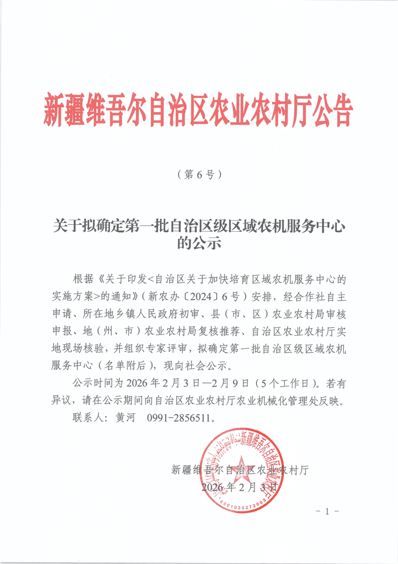 关于拟确定第一批自治区级区域农机服务中心的公示