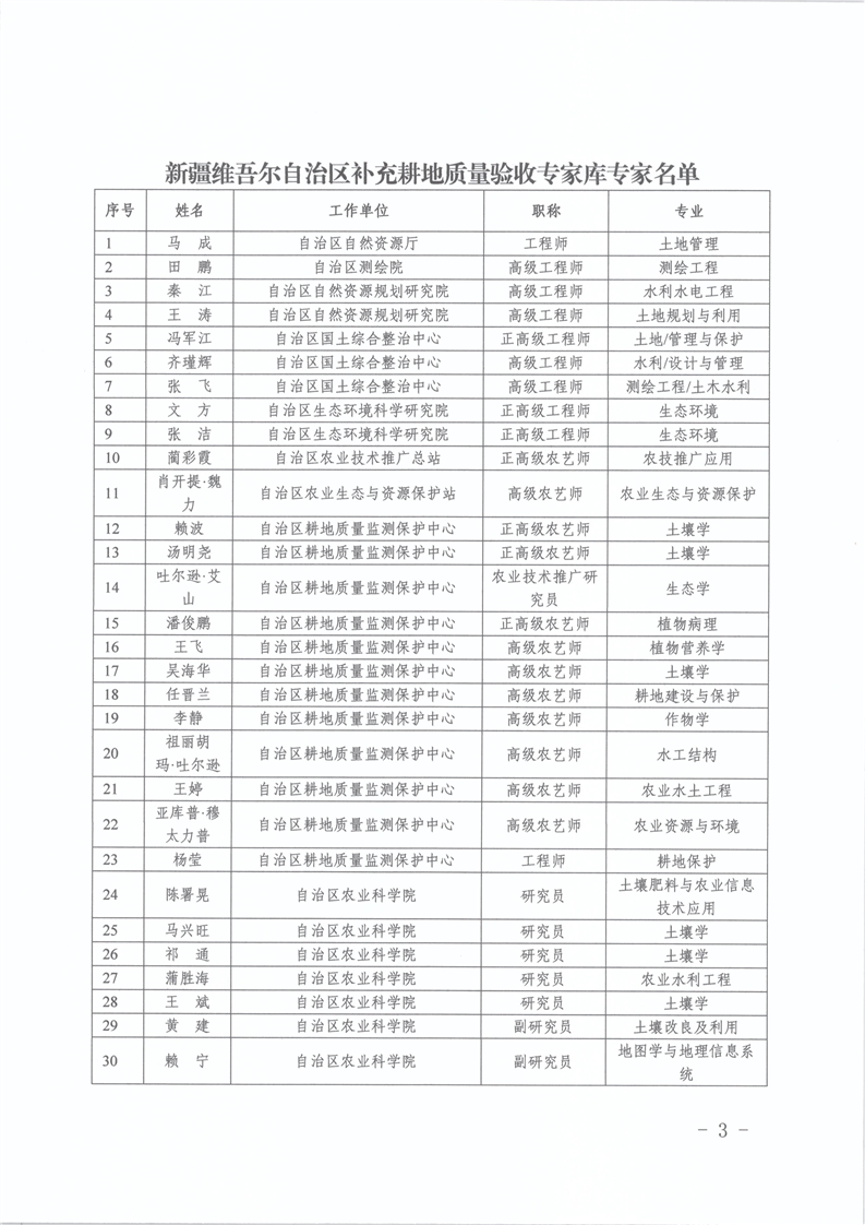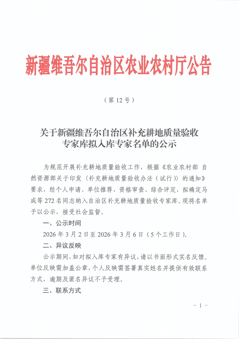 关于新疆维吾尔自治区补充耕地质量验收专家库拟入库专家名单的公示