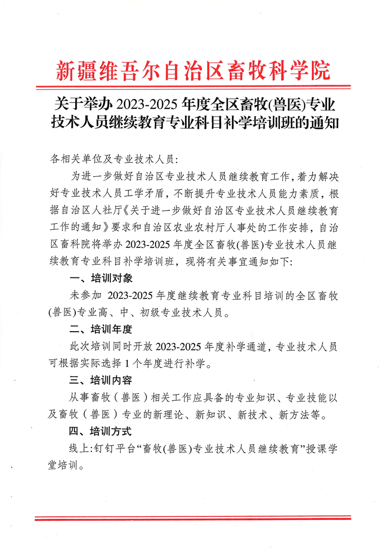 关于举办2023-2025年度全区畜牧(兽医)专业技术人员继续教育专业科目补学培训班的通知