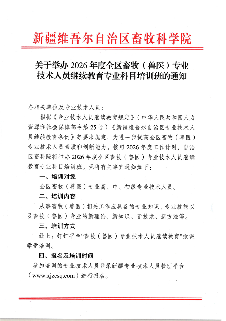 关于举办2026年度全区畜牧 (兽医 )专业技术人员继续教育专业科目培训班的通知