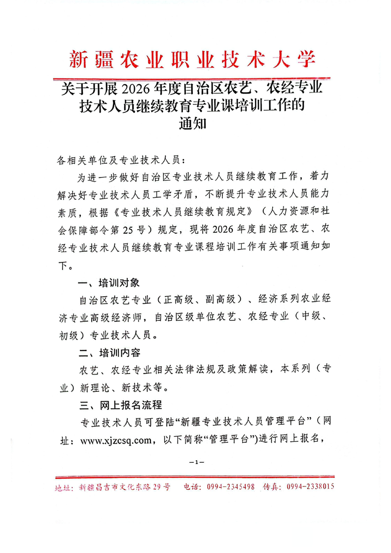 关于开展2026年度自治区农艺、农经专业技术人员继续教育专业课培训工作通知